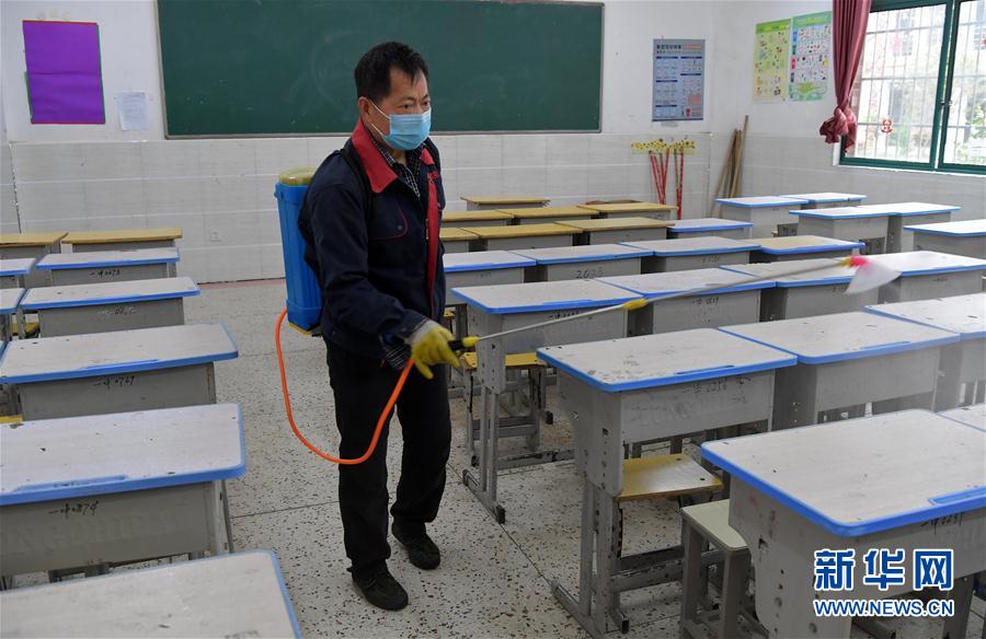 3月27日,在江西省南昌市湾里区第一中学内,工作人员在对教室进行消杀。 江西省各地高三、初三年级学生将于4月7日返校学习,各地学校目前正在进行防疫物资储备、校园各区域公共设施清洁消杀等工作,为开学复课做好准备。 新华社记者 彭昭之 摄