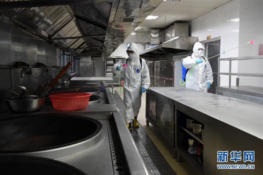 3月27日,在合肥市第四十六中学(南区),消防人员在食堂进行消毒杀菌。 为保障学生安全开学复课,近日,合肥市包河区联合市消防救援支队包河大队,对全区170余所校园进行消毒杀菌,全力营造安全卫生的校园环境。 新华社发(周牧 摄)