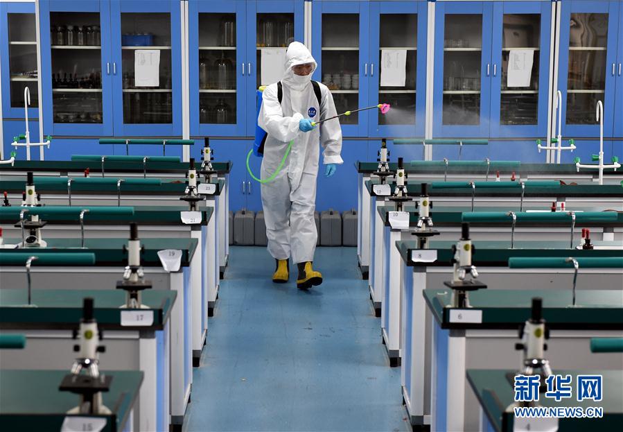 3月27日,在合肥市第四十六中学(南区),消防人员对实验室进行消毒杀菌。 为保障学生安全开学复课,近日,合肥市包河区联合市消防救援支队包河大队,对全区170余所校园进行消毒杀菌,全力营造安全卫生的校园环境。 新华社发(周牧 摄)