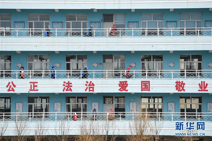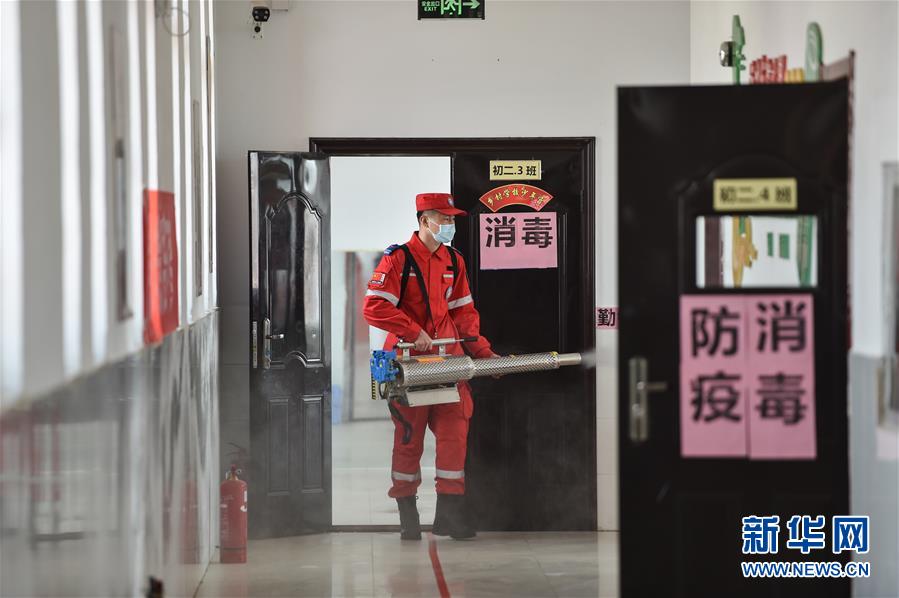 3月29日,工作人员对武川县新世纪学校的楼道进行消杀。 为做好高三和初三年级3月30日开学复课准备,内蒙古自治区武川县的中学校园开展消杀防疫工作,保障开学复课师生安全。 新华社记者 刘磊 摄