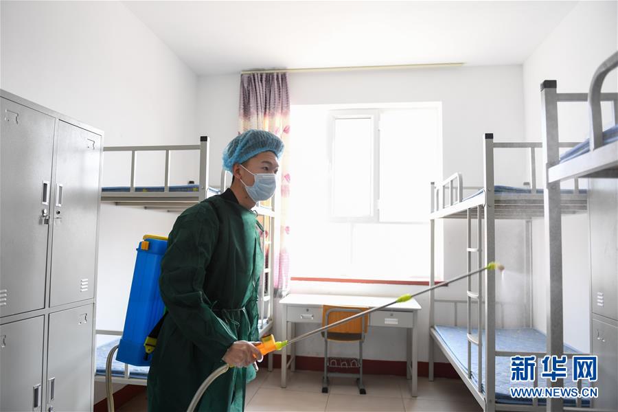 3月29日,工作人员对武川县第三中学的学生宿舍进行消杀。 为做好高三和初三年级3月30日开学复课准备,内蒙古自治区武川县的中学校园开展消杀防疫工作,保障开学复课师生安全。 新华社记者 刘磊 摄
