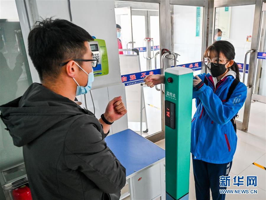 3月30日,呼和浩特市第三十五中学初三年级学生进入教学楼时测量体温。 当日,内蒙古自治区全区高三和初三年级开学复课。 新华社记者 连振 摄