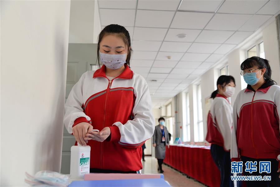 3月30日,学生在呼和浩特市第六中学教室外的走廊上使用免洗洗手液。 当日,内蒙古自治区全区高三和初三年级开学复课。 新华社记者 徐钦 摄