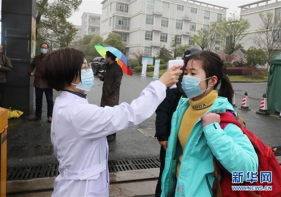 3月30日,在宜兴市丁蜀实验中学,医务人员正在为到校的初三学生测量体温。 当日,江苏省高三和初三年级开学复课。 新华社发(丁焕新 摄)