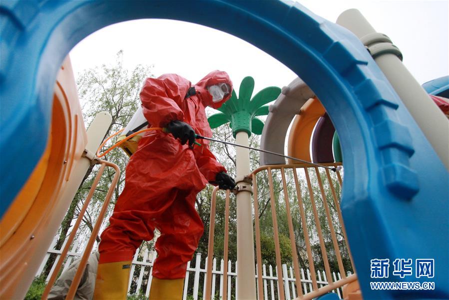 3月30日,消防员在扬州市杉湾幼儿园内进行消杀作业。 当日,扬州市广陵区汤汪乡杉湾花园社区联合扬州市消防救援支队,对辖区内的杉湾幼儿园进行全面消杀,全力营造安全卫生的校园环境,为学生入学复课做好准备。 新华社发(孟德龙 摄)