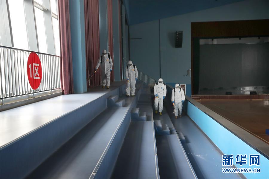 3月30日,消防员在江苏省南通市一学校体育馆进行消杀作业。 从3月25日起,江苏省南通市消防救援支队开始对全市范围内的大中专院校、中小学校及幼儿园进行消杀作业,全力营造安全卫生的校园环境,为学生入学复课做好准备。 新华社发(许丛军 摄)
