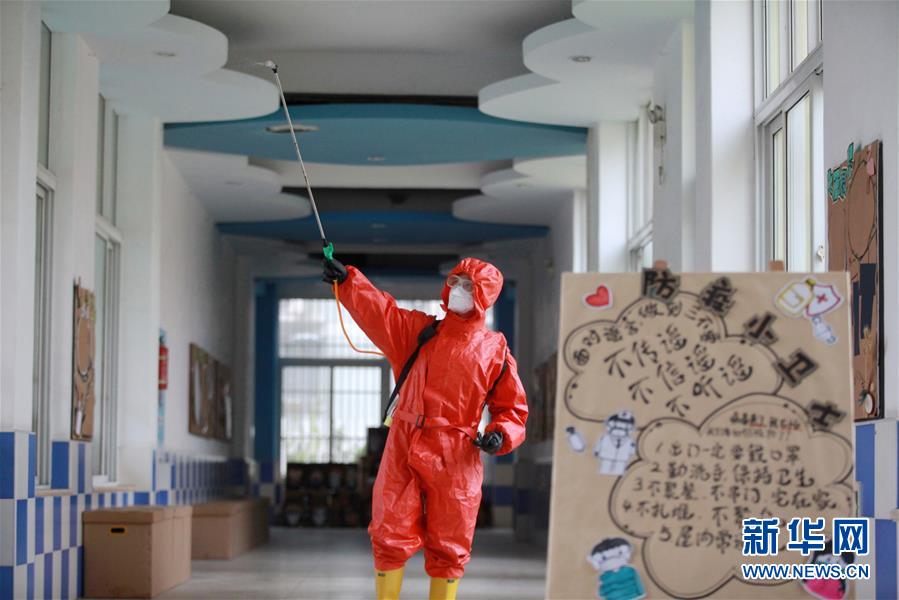 3月30日,消防员在扬州市杉湾幼儿园对教室走廊进行消杀。 当日,扬州市广陵区汤汪乡杉湾花园社区联合扬州市消防救援支队,对辖区内的杉湾幼儿园进行全面消杀,全力营造安全卫生的校园环境,为学生入学复课做好准备。 新华社发(孟德龙 摄)