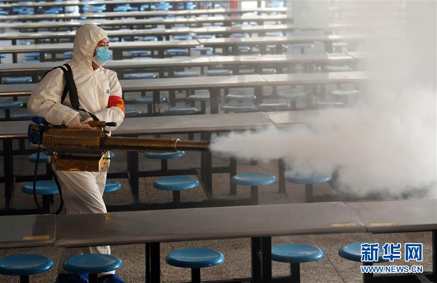 3月30日,安徽省亳州市谯城区城市管理局疫情防控机构的工作人员在亳州二中的学生食堂进行消杀作业。 安徽省亳州市谯城区城市管理局疫情防控机构从近日起开始协助教育部门对辖区内的中学进行消杀作业,全力营造安全卫生的校园环境,为初高三学生开学复课做好准备。 新华社发(张延林 摄)