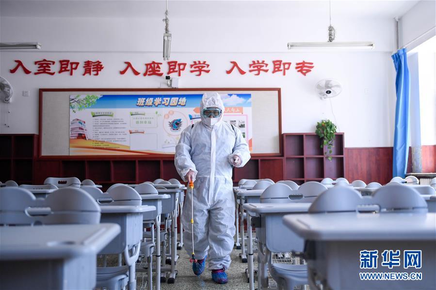 4月2日,长春市十一高中的工作人员在教室进行消杀。 新华社发(颜麟蕴 摄)