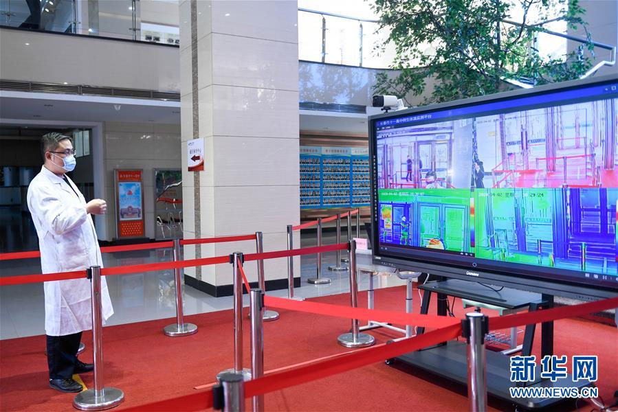 4月2日,长春市十一高中的工作人员在教学楼内测试测温仪。新华社发(颜麟蕴 摄)