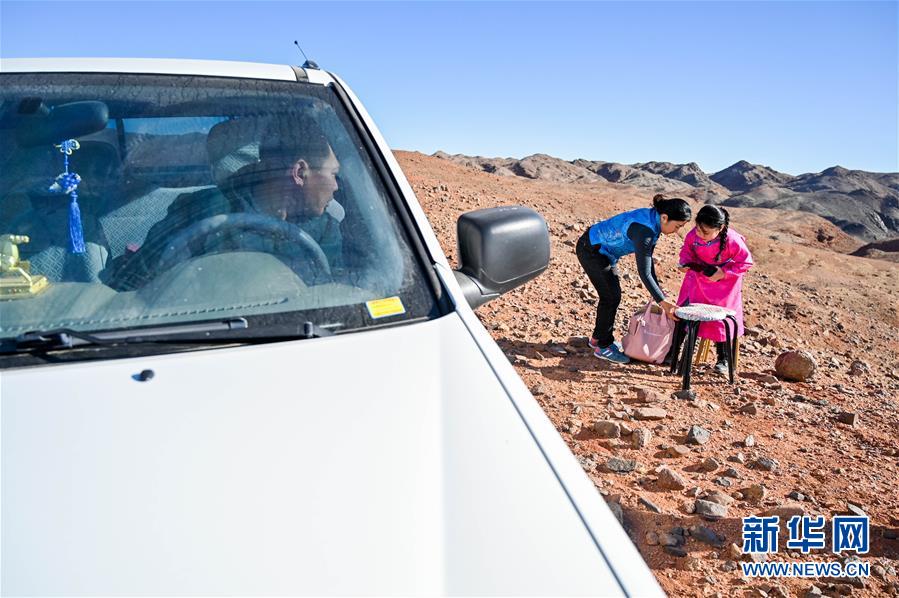 4月1日,策耿拿着板凳寻找避风处上网课。 新华社记者 连振 摄