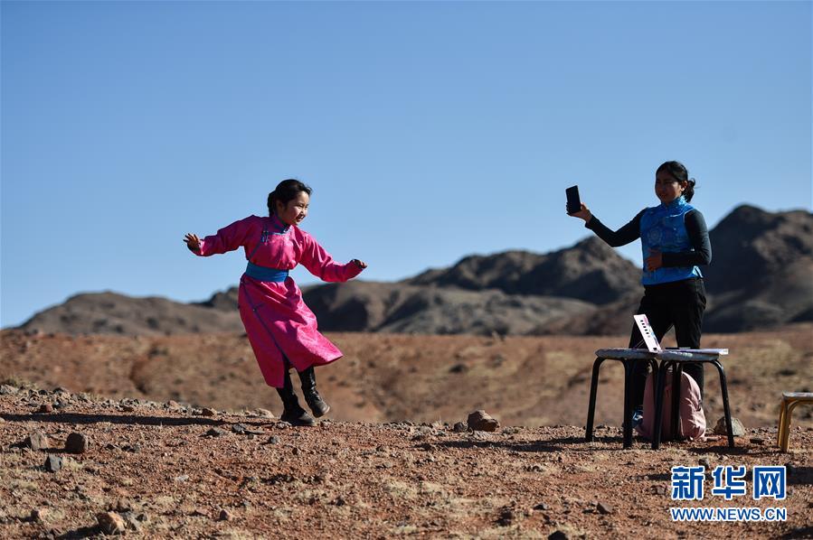 4月1日,在策耿家附近的戈壁上,母亲伊日贵(右)在课间陪着策耿练习蒙古族舞蹈。 新华社记者 刘磊 摄