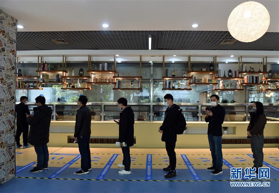 4月3日,工作人员在合肥市第八中学模拟演练“学生”排队就餐。 当日,合肥市第八中学开展返校开学防疫演练,全体教职工学习各类防疫知识,并模拟演练学生入校测温、发热应急处置、有序就餐等防疫措施,为安全有序开学做好准备。合肥市高三学生将于4月7日开学。 新华社发 (周牧 摄)