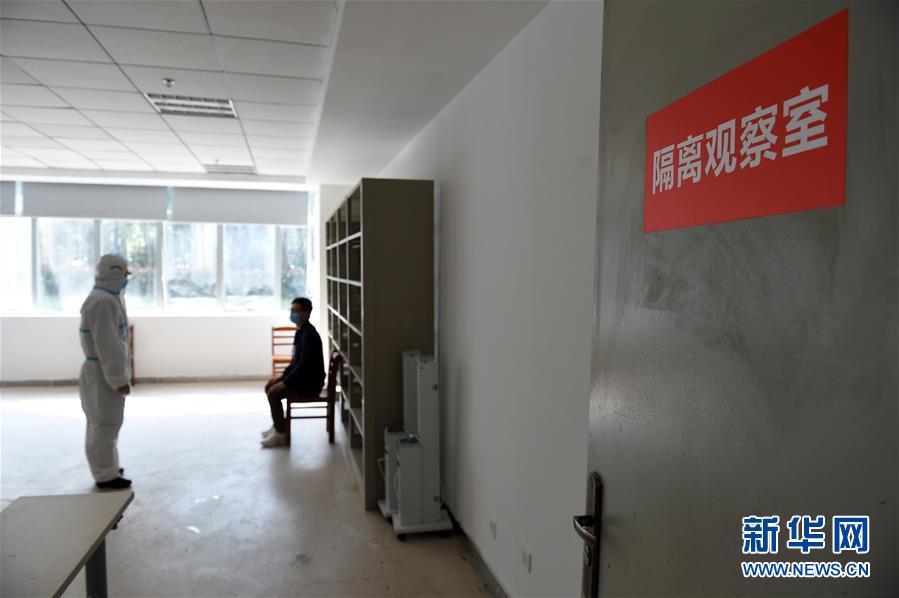 4月3日,在合肥市第八中学,工作人员在演练中模拟对“发热学生”进行隔离观察。 当日,合肥市第八中学开展返校开学防疫演练,全体教职工学习各类防疫知识,并模拟演练学生入校测温、发热应急处置、有序就餐等防疫措施,为安全有序开学做好准备。合肥市高三学生将于4月7日开学。 新华社发 (周牧 摄)
