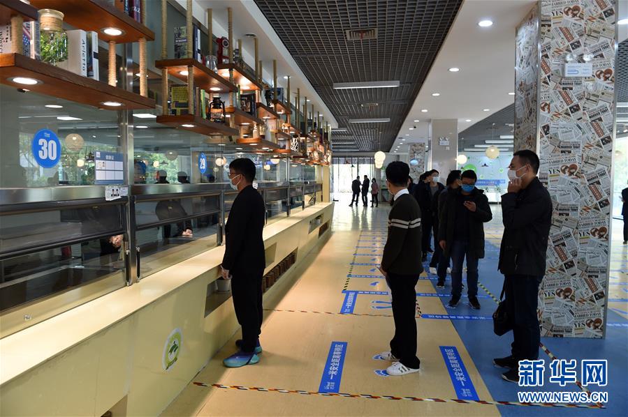 4月3日,工作人员在合肥市第八中学模拟演练“学生”排队就餐。 当日,合肥市第八中学开展返校开学防疫演练,全体教职工学习各类防疫知识,并模拟演练学生入校测温、发热应急处置、有序就餐等防疫措施,为安全有序开学做好准备。合肥市高三学生将于4月7日开学。 新华社发 (周牧 摄)