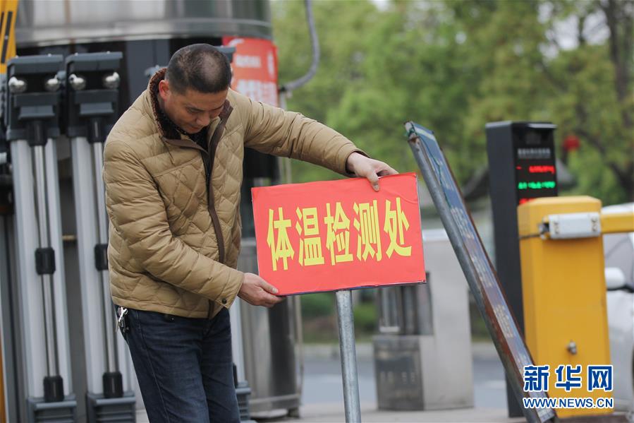 4月6日,在湖南省道县第一中学,工作人员在校门口布置体温检测标识。 近日,湖南省永州市各学校按照疫情防控工作的部署,精心准备迎接开学复课。根据湖南省教育厅下发的通知,湖南省内中学高三、初三年级将于4月7日开学。 新华社发(何红福 摄)