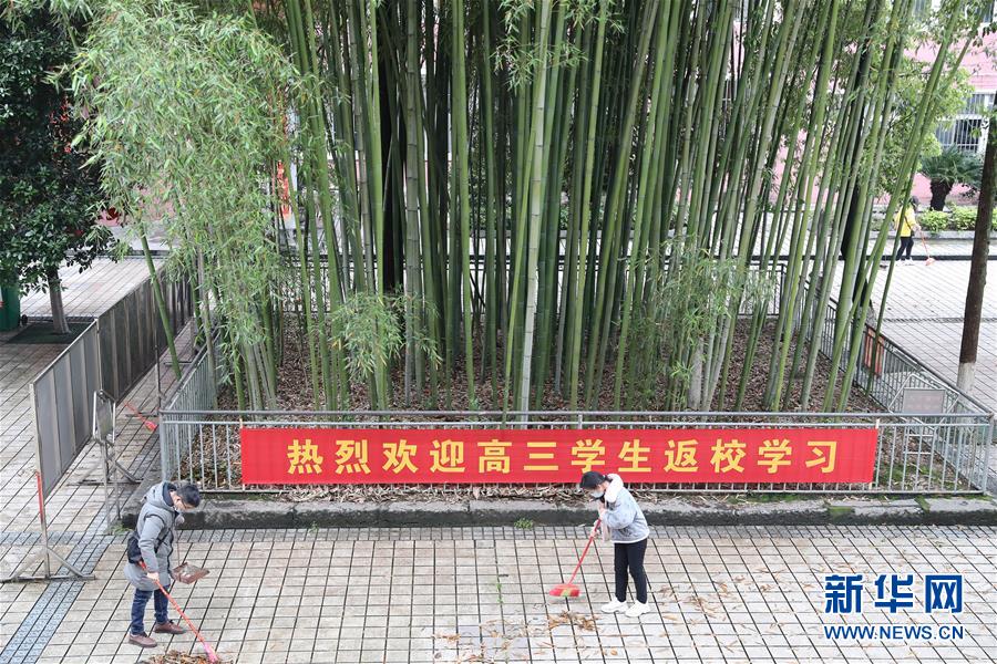 4月6日,在湖南省道县第一中学,老师在校园里打扫卫生。 近日,湖南省永州市各学校按照疫情防控工作的部署,精心准备迎接开学复课。根据湖南省教育厅下发的通知,湖南省内中学高三、初三年级将于4月7日开学。 新华社发(何红福 摄)