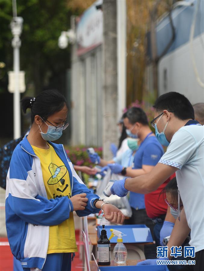 4月6日,在三亚市第一中学,高三学生在校门前测量体温。 当日,海南省三亚市第一中学高三、初三年级的学生陆续返回校园。据悉,海南省各个学校的高三、初三年级预定在4月7日开学。 新华社发(沙晓峰 摄)