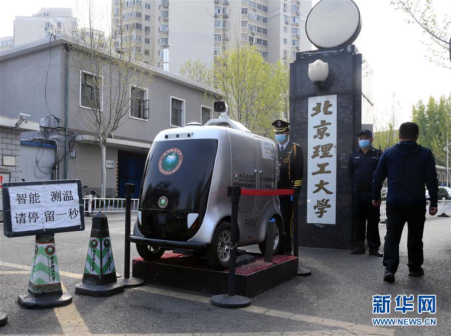 4月6日,在北京理工大学中关村校区北门,工作人员(左一)查看无人配送车监测进入校园人员的体温情况。