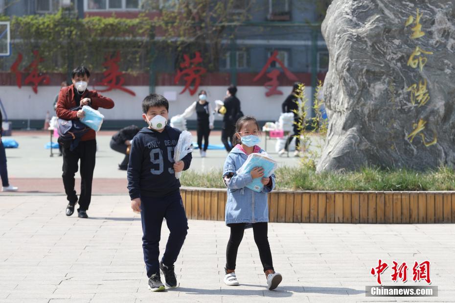 4月6日,在北京市朝阳区垂杨柳中心小学,两名小学生拿到新领的教材。近日,北京中小学校开始陆续向在京学生及家长发放教材。此前,北京市教委发布消息,4月13日全市将启动中小学线上学科教学,在京学生的教材将于4月13日之前发放到位,不在京的学生可下载电子教材使用。中新社记者 蒋启明 摄