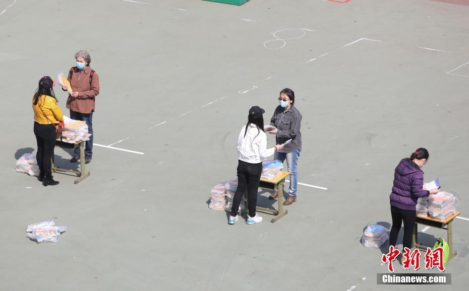 4月6日,在北京市朝阳区垂杨柳中心小学,老师在向学生家长发放教材。近日,北京中小学校开始陆续向在京学生及家长发放教材。此前,北京市教委发布消息,4月13日全市将启动中小学线上学科教学,在京学生的教材将于4月13日之前发放到位,不在京的学生可下载电子教材使用。中新社记者 蒋启明 摄