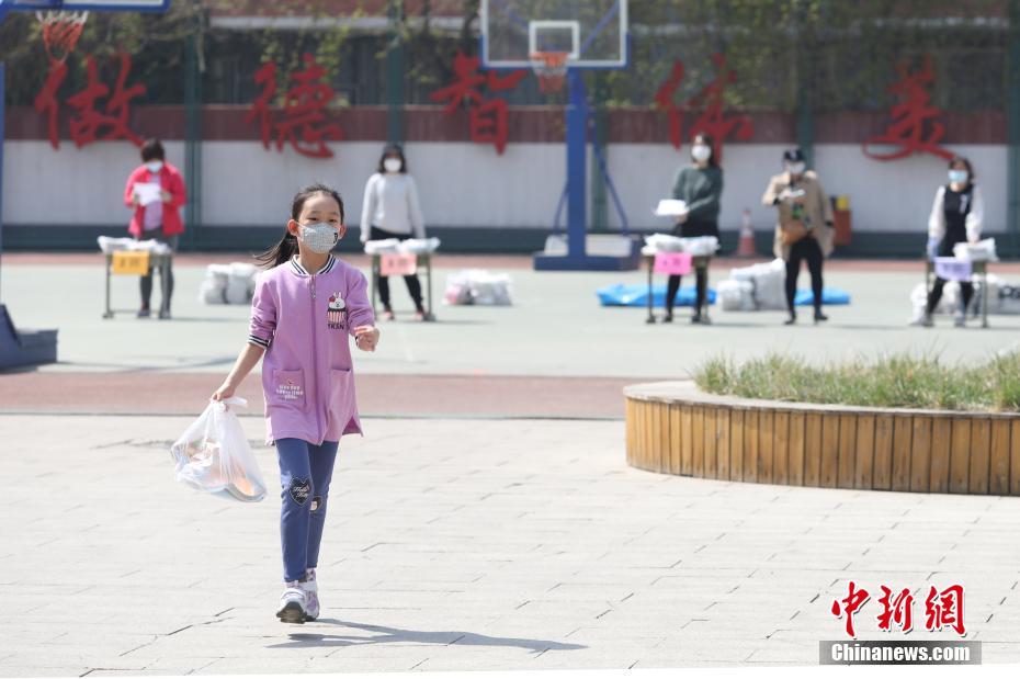 4月6日,在北京市朝阳区垂杨柳中心小学,一名小学生拿到新领的教材。近日,北京中小学校开始陆续向在京学生及家长发放教材。此前,北京市教委发布消息,4月13日全市将启动中小学线上学科教学,在京学生的教材将于4月13日之前发放到位,不在京的学生可下载电子教材使用。中新社记者 蒋启明 摄
