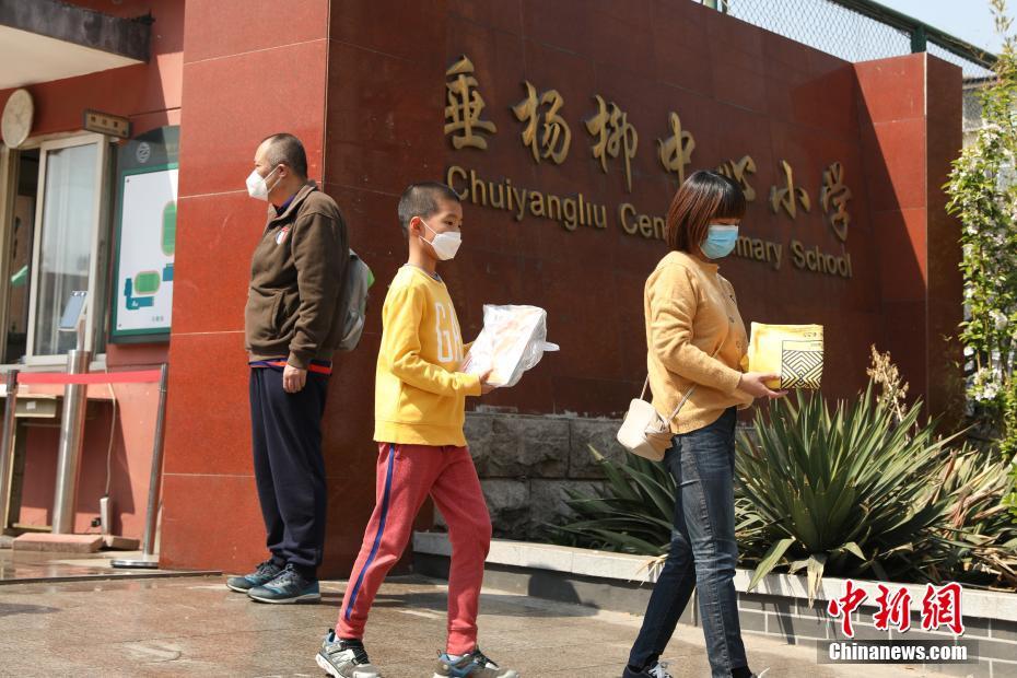 4月6日,在北京市朝阳区垂杨柳中心小学,一名小学生拿着领到的教材走出校门。近日,北京中小学校开始陆续向在京学生及家长发放教材。此前,北京市教委发布消息,4月13日全市将启动中小学线上学科教学,在京学生的教材将于4月13日之前发放到位,不在京的学生可下载电子教材使用。中新社记者 蒋启明 摄