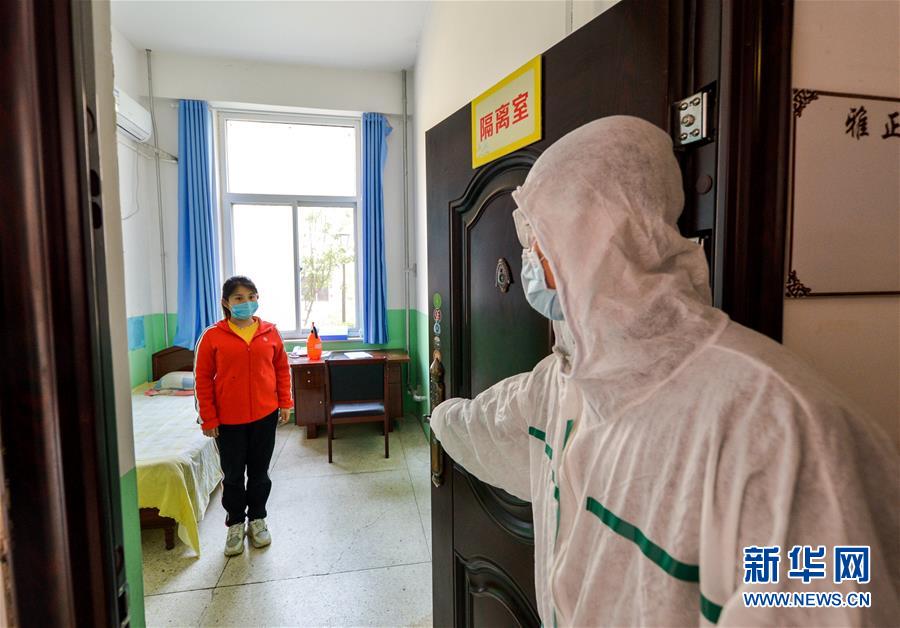 4月7日,防疫人员在邯郸市邯山区赵王小学演练将“发热学生”安置在隔离室。 当日,河北省邯郸市邯山区教育部门组织多所小学开展返校开学防疫演练,制定开学防疫方案,演练模拟师生入校、发热应急处置等环节,提高学校疫情防控应急水平,保障安全有序复课。 新华社记者 王晓 摄