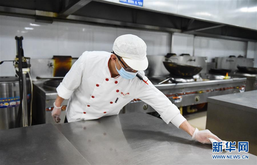 4月9日,在太原理工大学明向校区静雅轩餐厅,工作人员在擦拭后厨桌面。 据山西省教育厅消息,山西省高校本硕博毕业年级将于4月10日起错峰分批开学。山西省各高校全面推进封闭管理、分散住宿、教职工培训、公共场所消杀等各项开学准备工作,保障学生安全复课。 新华社发 (柴婷 摄)