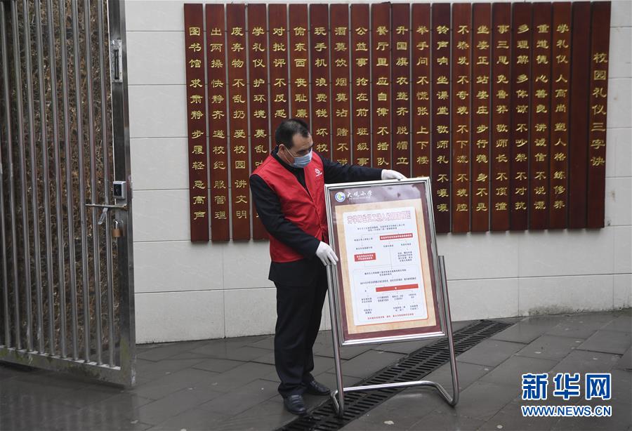 4月11日,大观镇中心小学校工作人员在摆放“师生员工进入校园流程图”。 当日,重庆市南川区大观镇中心小学校开展返校开学防疫演练,模拟演练学生入校测温、发热应急处置、校园消杀等防疫措施,为安全有序开学做好准备。 新华社记者王全超摄