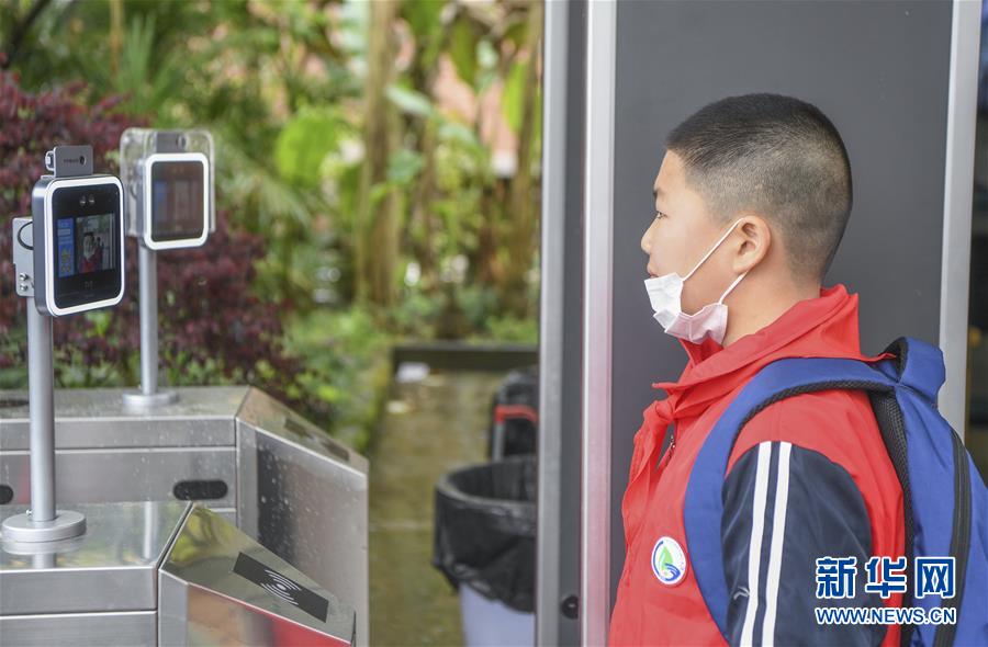 4月11日,参与演练的大观镇中心小学校学生代表模拟演练“进入校园时接受人脸识别和红外线体温测量”。 当日,重庆市南川区大观镇中心小学校开展返校开学防疫演练,模拟演练学生入校测温、发热应急处置、校园消杀等防疫措施,为安全有序开学做好准备。 新华社记者王全超摄