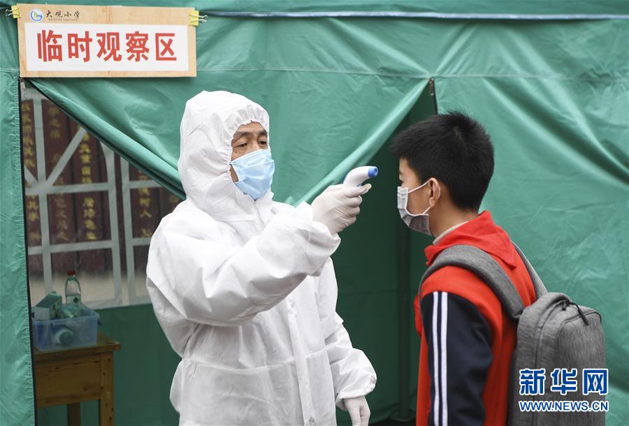 4月11日,参与演练的大观镇中心小学校工作人员(左)模拟演练为学生测体温。 当日,重庆市南川区大观镇中心小学校开展返校开学防疫演练,模拟演练学生入校测温、发热应急处置、校园消杀等防疫措施,为安全有序开学做好准备。 新华社记者王全超摄