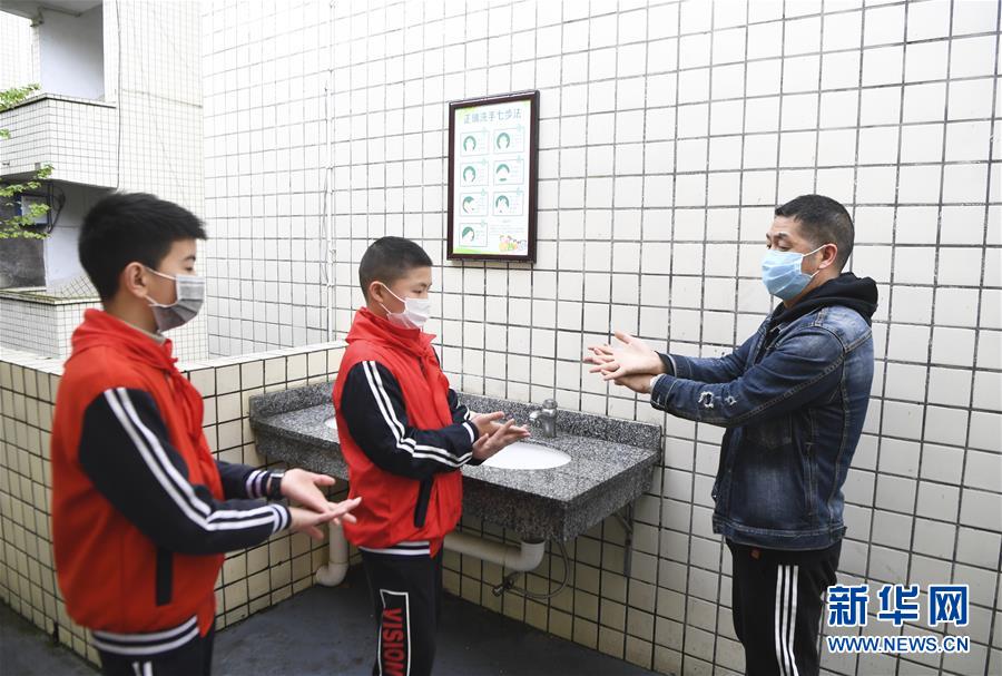 4月11日,参与演练的大观镇中心小学校工作人员(右一)模拟演练教学生正确洗手。 当日,重庆市南川区大观镇中心小学校开展返校开学防疫演练,模拟演练学生入校测温、发热应急处置、校园消杀等防疫措施,为安全有序开学做好准备。 新华社记者王全超摄