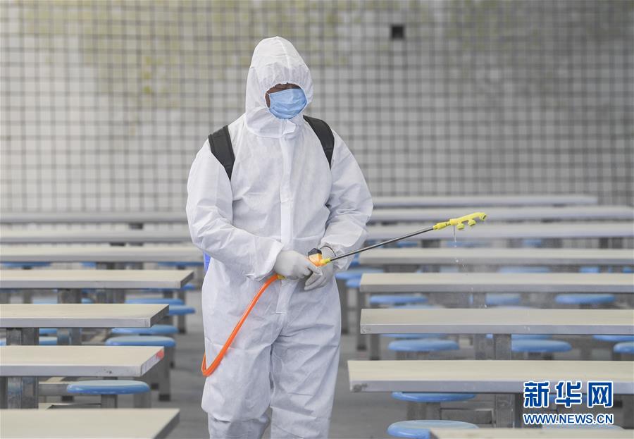 4月11日,参与演练的大观镇中心小学校工作人员在食堂进行消毒。 当日,重庆市南川区大观镇中心小学校开展返校开学防疫演练,模拟演练学生入校测温、发热应急处置、校园消杀等防疫措施,为安全有序开学做好准备。 新华社记者王全超摄