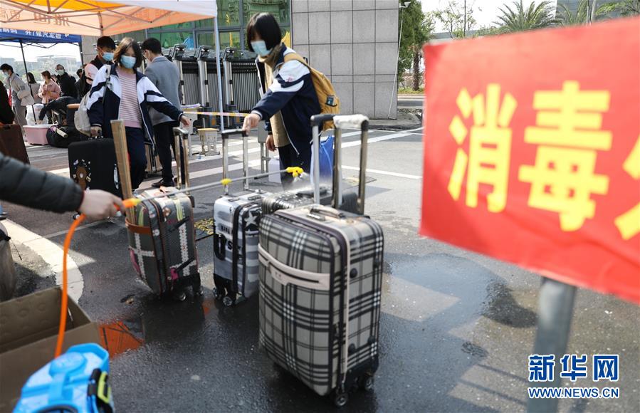 4月13日,在湖南永州道县第一中学校门口,老师给高二年级学生行李消毒。新华社发(何红福 摄)