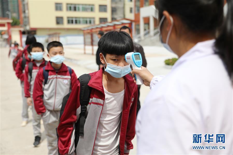 4月13日,在湖南永州道县敦颐学校,初一年级学生接受体温测量。新华社发(何红福 摄)