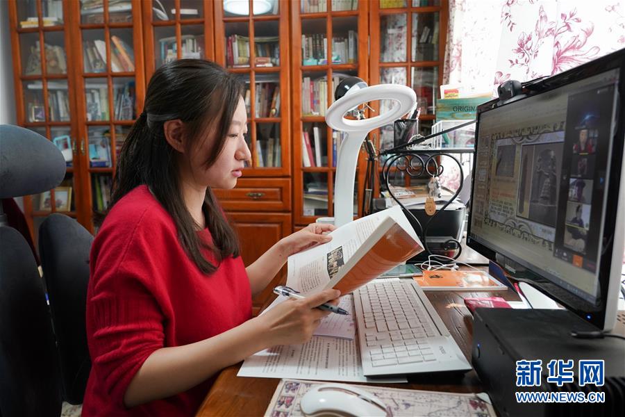 4月13日,人大附中西山学校高一历史老师李响在家中为学生上课。新华社记者 鞠焕宗 摄
