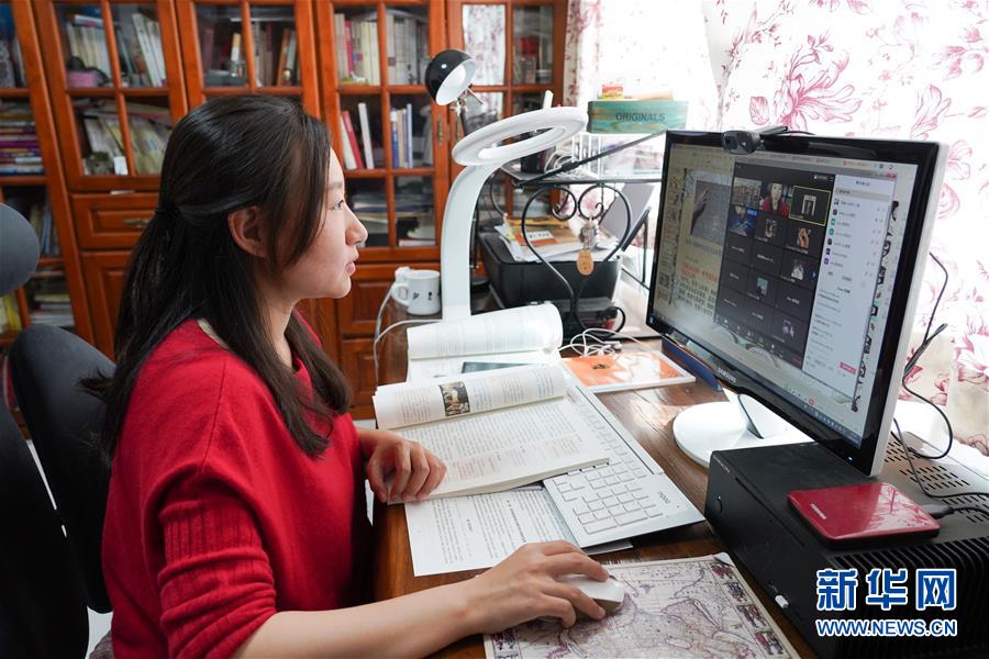 4月13日,人大附中西山学校高一历史老师李响在家中为学生上课。新华社记者 鞠焕宗 摄