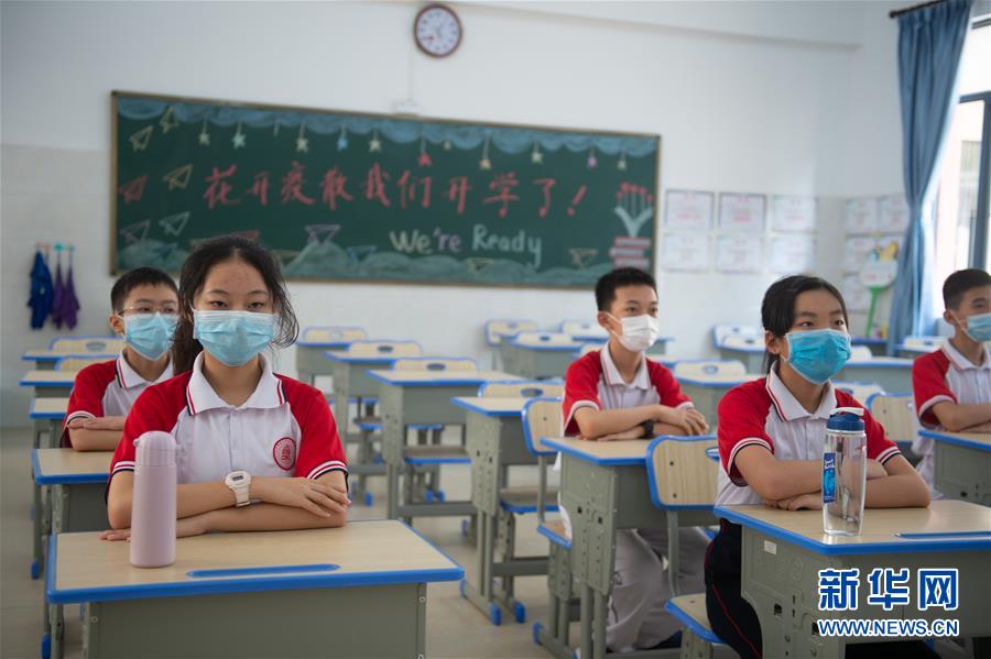4月16日,北京师范大学海口附属学校已经复课的初一年级学生在演练中模拟上课。