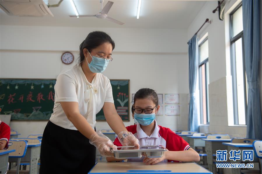 4月16日,北京师范大学海口附属学校教师在演练中发放午餐。新华社发(张丽芸摄)