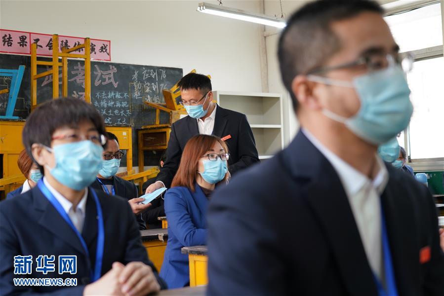 4月21日,教师演练发放口罩流程。 当日,河北南宫中学举行返校开学防疫演练,模拟入校、应急处置、用餐、入住宿舍等环节,进一步熟练疫情防控流程,保障安全有序复课。据悉,河北省普通高中毕业年级将于4月23日开学。 新华社记者 牟宇 摄