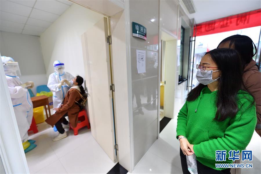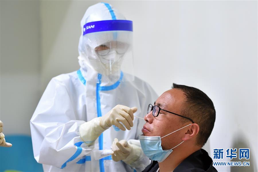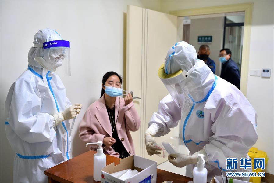 4月20日,在湖北省襄阳市保康县人民医院检测点,医务人员在给保康一中教师采集鼻咽拭子。 为保障春季开学工作有序进行,确保师生员工安全健康,近日,湖北省襄阳市保康县组织全县767名高三、初三年级教师及学校管理服务人员进行核酸检测。检测结果阴性并且无发热、干咳、乏力等疑似症状的教职员工,才可返校返岗。 新华社发(杨韬 摄)