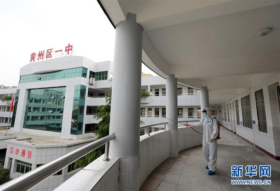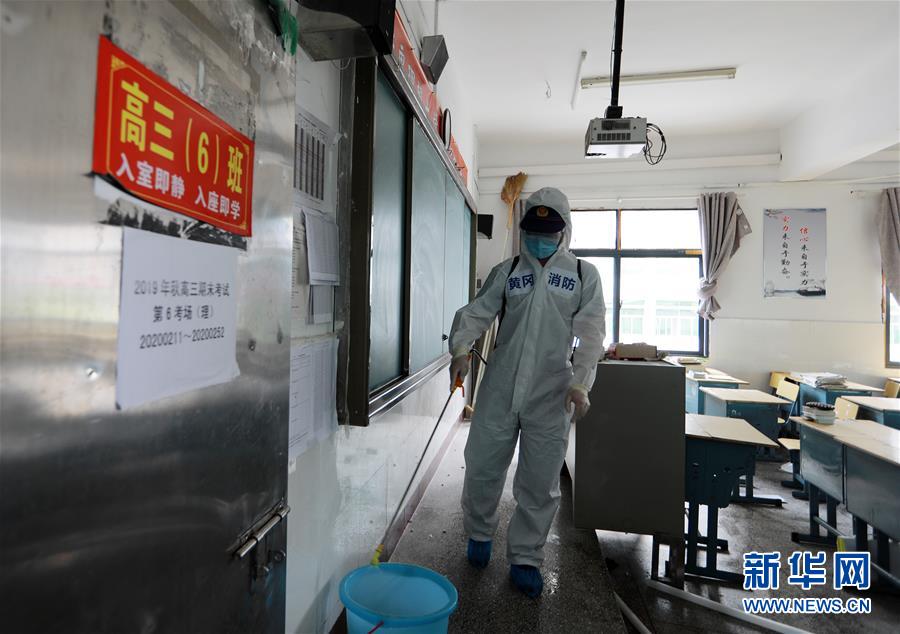 4月22日,在湖北省黄冈市黄州区第一中学,一名消防员对高三年级教室进行消杀。新华社发(王方 摄)