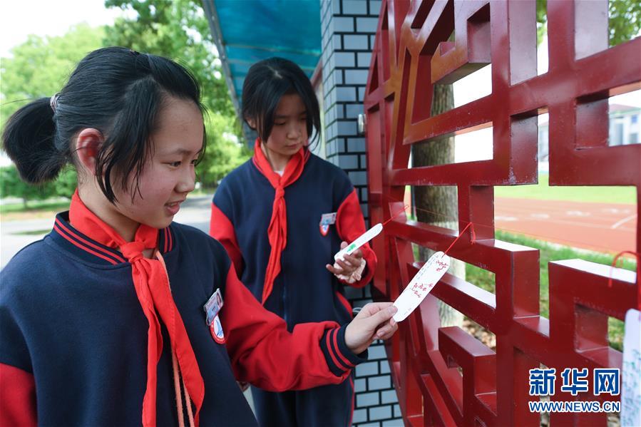 4月22日,学生们在校园内观看自制书签展示。 当日,浙江省湖州市织里镇轧村中学举行复课以来首次“校园读书会”,开展书签制作展示、征文交流、名著精彩片段分享等系列活动,营造乡村学校的校园文化氛围,让学生养成良好的阅读与学习习惯。 新华社记者 徐昱 摄