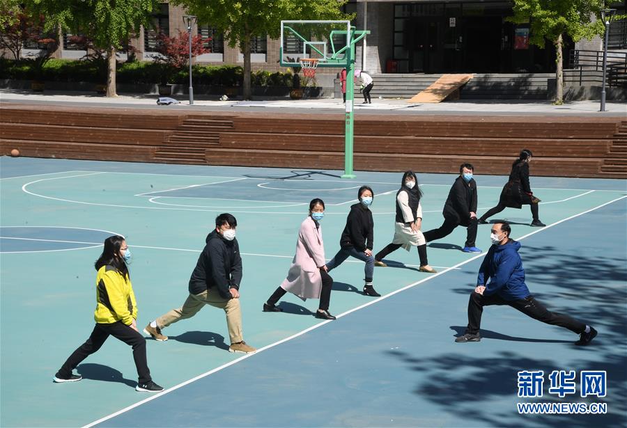 4月22日,在北京大学附属中学,参加模拟演练的教师演练高三年级学生上体育课。 当日,位于北京市海淀区的北京大学附属中学开展第3次高三年级返校复学防疫演练,模拟演练学生入校测温、体温异常学生应急处置等防疫环节,保障师生安全有序返校开学。据悉,北京市高三年级4月27日开始返校学习。 新华社记者 任超 摄