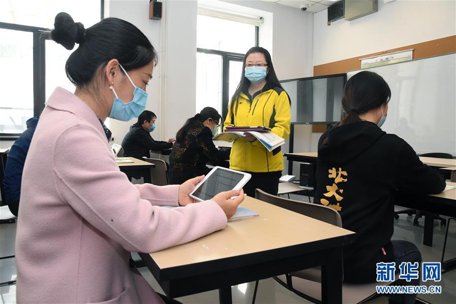 4月22日,在北京大学附属中学,教师们在模拟演练利用学校自主研发的高三备考系统进行课上答疑。 当日,位于北京市海淀区的北京大学附属中学开展第3次高三年级返校复学防疫演练,模拟演练学生入校测温、体温异常学生应急处置等防疫环节,保障师生安全有序返校开学。据悉,北京市高三年级4月27日开始返校学习。 新华社记者 任超 摄