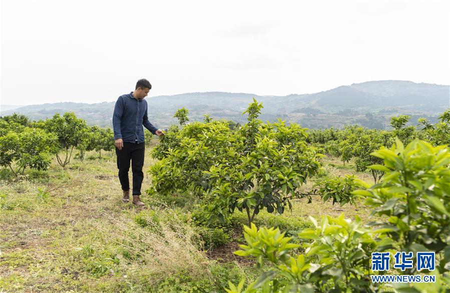 4月25日,肖钦仁走过成都金堂县赵家镇阳河街社区的一片果园。 新华社记者 李梦馨 摄
