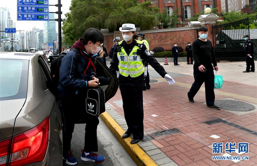 4月27日,上海市公安局徐汇分局交警支队的民警顾婧妮在徐汇中学校门外引导返校学生下车。新华社记者 凡军 摄