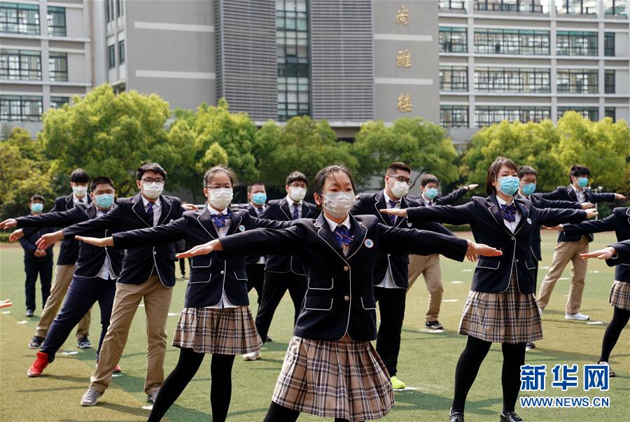 4月27日,华东师范大学第一附属中学的高三学生在做广播体操。 当日,上海高三年级、初三年级学生返校开学。 新华社记者 刘颖 摄