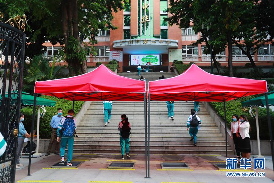 4月27日,广州市第二中学学生在教师引导下进入教学楼。 当日,广州市初三高三年级返校。 新华社记者 卢烨 摄